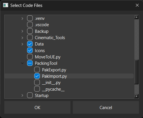 Select Code: A file selection dialog that allows you to select specific .py files from the specified code root folder. Only .py files and directories are displayed in the dialog.