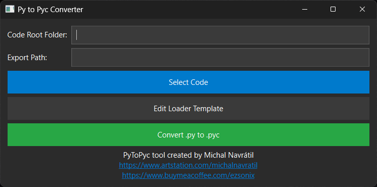 Convert Files: Click the "Convert .py to .pyc" button to compile the selected .py files to .pyc files and create the loader scripts.