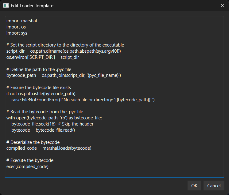 Edit Loader Template: Opens a text editor where you can customize the template used to generate the loader scripts. The template is saved in the settings for future use.
